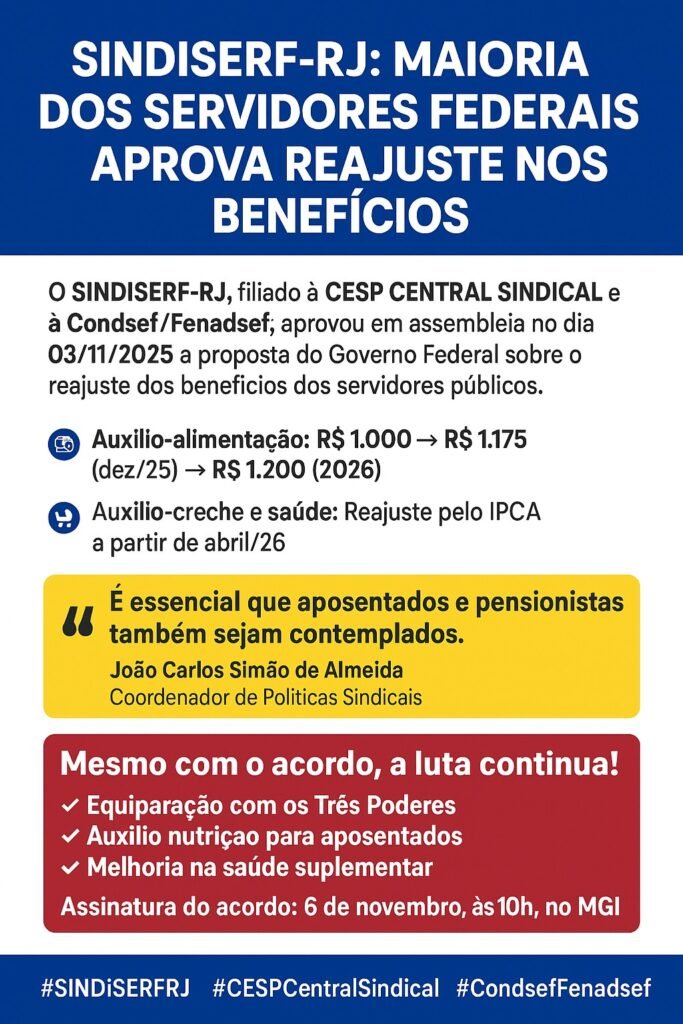 O SINDISERF-RJ, filiado à CESP CENTRAL SINDICAL e à Condsef/Fenadsef, aprovou em assembleia realizada no dia 03 de novembro de 2025 a proposta do Governo Federal sobre o reajuste dos benefícios dos servidores públicos. Durante a assembleia, o Coordenador de Políticas Sindicais, João Carlos Simão de Almeida, destacou a importância de garantir que aposentados e pensionistas também sejam contemplados com os mesmos reajustes. A maioria das assembleias realizadas em todo o país aprovou a proposta e autorizou a Condsef/Fenadsef a assinar o termo de acordo com o MGI, garantindo aumento no valor do auxílio-alimentação, auxílio-creche e assistência à saúde. 📝