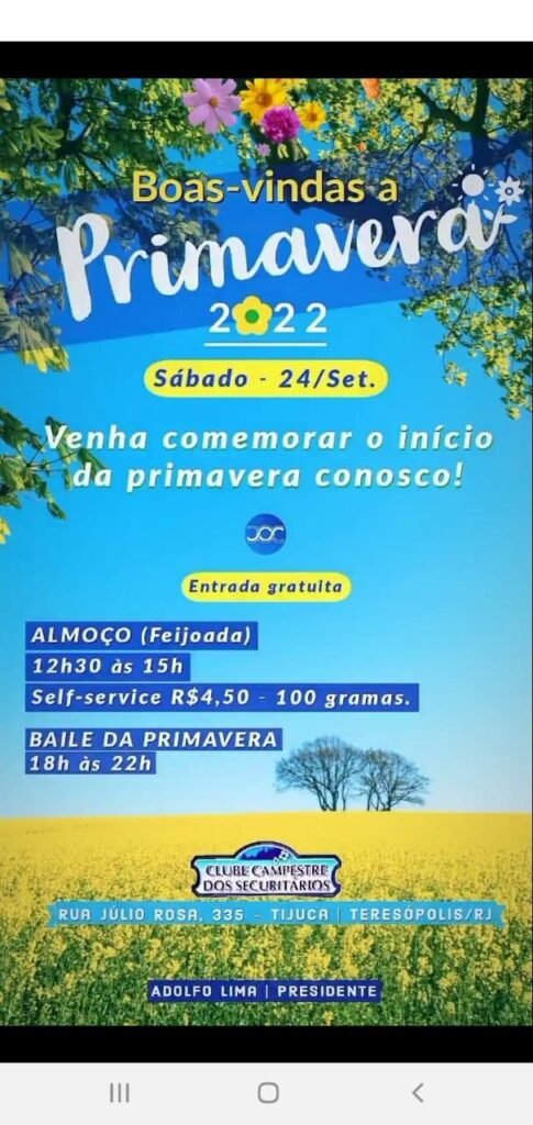 Almoço (feijoada) 12h30 às 15h (R$4,50 100g). Baile da Primavera de 18h às 22h