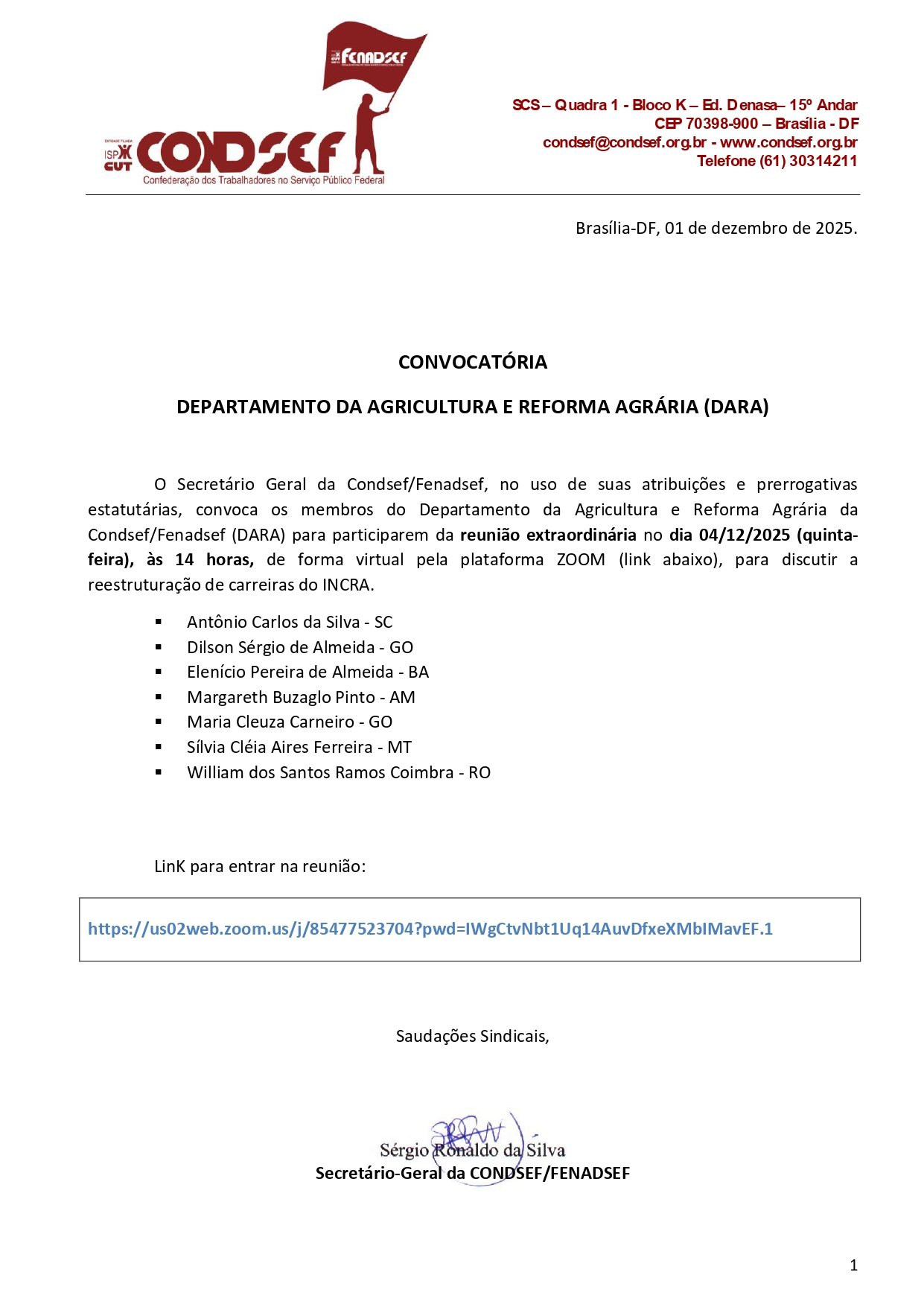 Encaminho, em anexo, a convocação para a reunião extraordinária do Departamento da Agricultura e Reforma Agrária da Condsef/Fenadsef (DARA), a ser realizada no dia 04 de dezembro de 2025 (quinta-feira), às 14h, de forma virtual pela plataforma Zoom. A reunião terá como pauta principal a discussão sobre a reestruturação de carreiras do INCRA. Solicitamos atenção ao documento anexado para todas as informações detalhadas e o link de acesso à reunião.