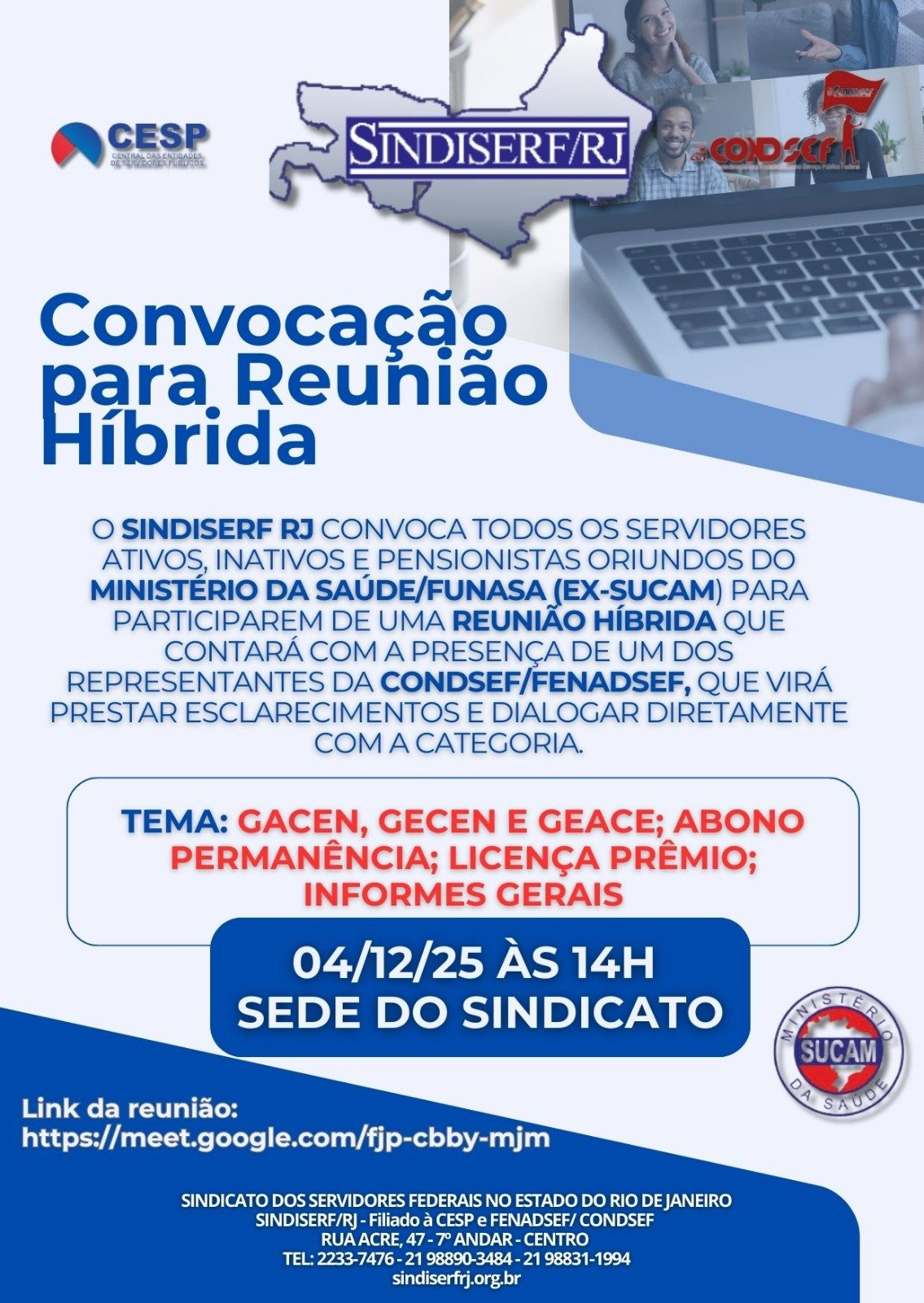O SINDISERF-RJ convoca servidores ativos, inativos e pensionistas oriundos do Ministério da Saúde/FUNASA (ex-SUCAM) para reunião no dia 04/12/2025, às 14h.