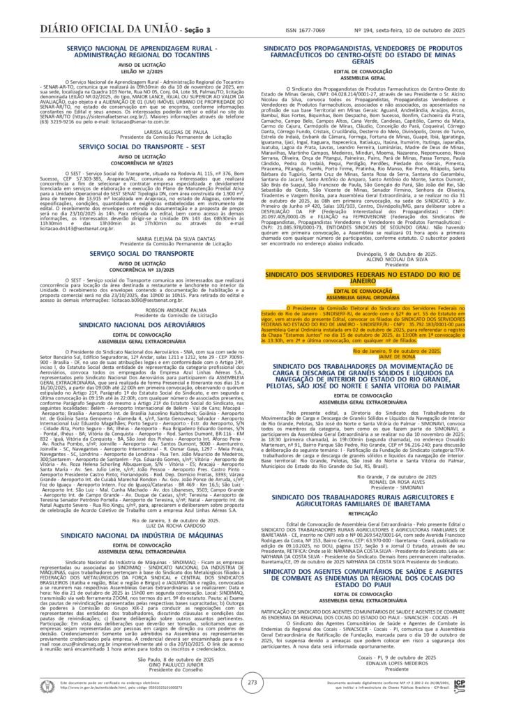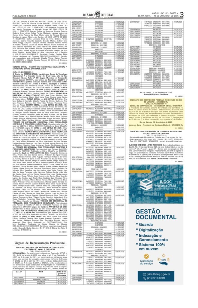 O Sindicato dos Servidores Federais no Estado do Rio de Janeiro (SINDISERF/RJ) convocou seus filiados para uma Assembleia Geral Ordinária. A assembleia será realizada no dia 15 de outubro de 2025.
