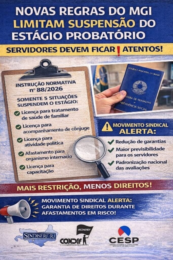 📰 SINDISERF/RJ INFORMA: Nova norma do MGI limita suspensão do estágio probatório e exige atenção dos servidores O Ministério da Gestão e da Inovação em Serviços Públicos (MGI) publicou a Instrução Normativa nº 88/2026, que altera regras do estágio probatório dos servidores públicos federais e restringe para apenas cinco situações os casos de suspensão desse […]